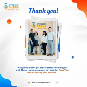 We extend our sincere appreciation to Mr. Yam Jee and Mona from Australia for visiting our office at Student Vibes Education.